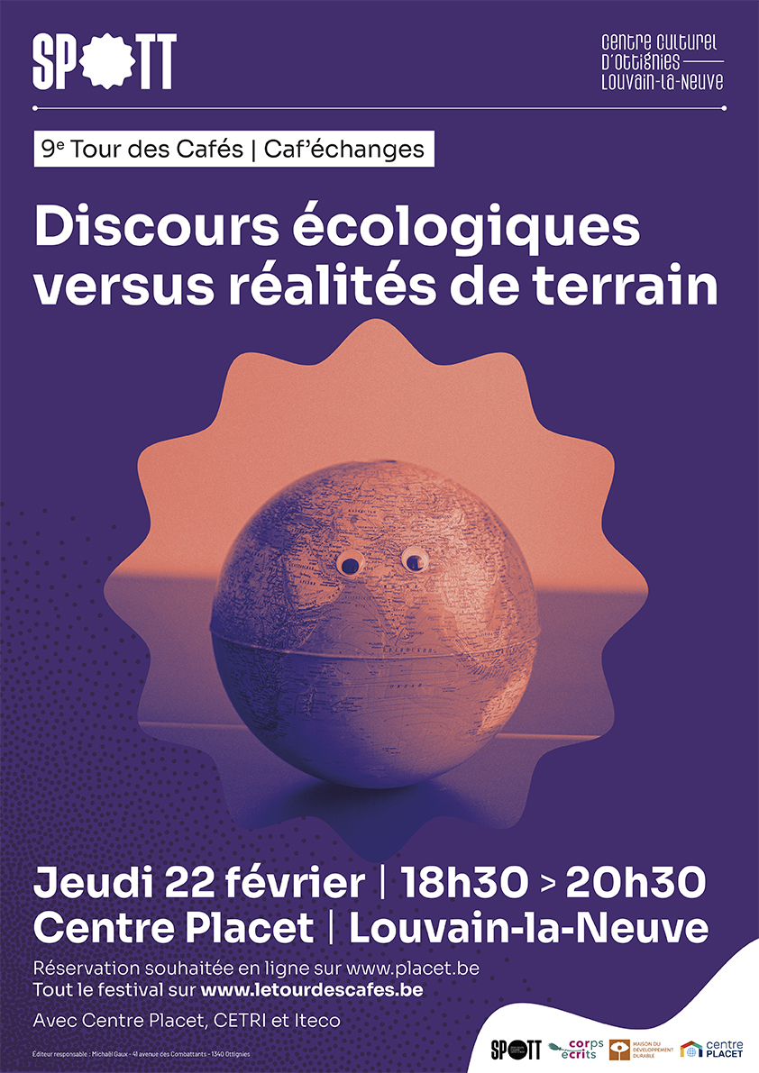 sur la thématique "Discours écologiques vs. réalités de terrain", au Centre de documentation du Centre Placet, Rue des Sports 2 à 1348 Louvain-la-Neuve.